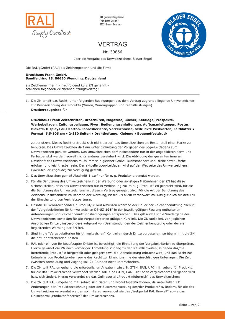 Der Blaue Engel DE-UZ 195 zertifiziert nicht alleine das Papier oder den Karton, sondern das gesamte Druckprodukt. Durch die strengen Vergaberichtlinien gibt es nur sehr wenige Druckereien in Deutschland, die zertifiziert sind. Das Druckhaus Frank ist seit Juni 2023 auch zertifiziert und bietet Printprodukte, die den hohen Anforderungen an das Umweltzeichen der Bundesregierung gerecht werden.
