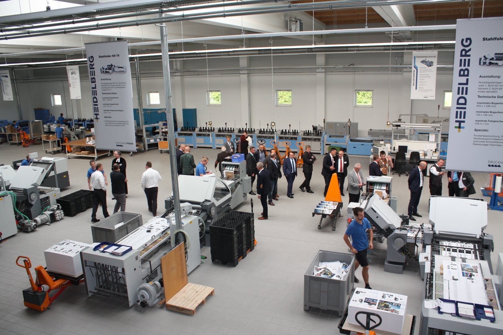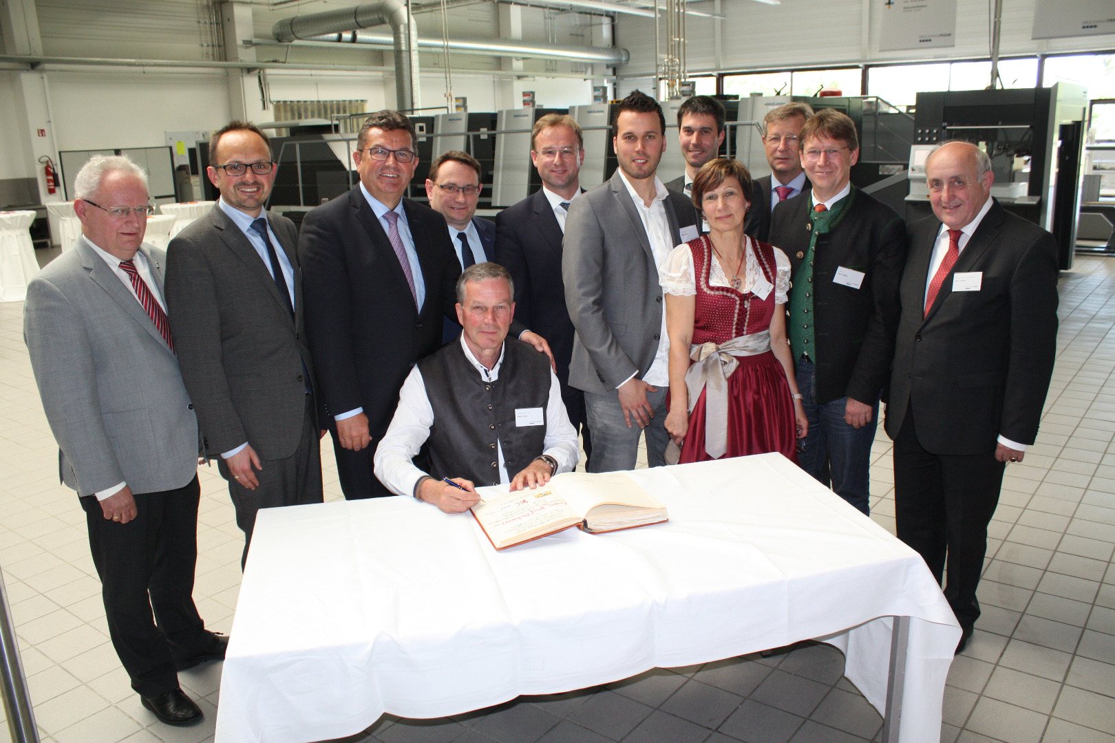 Hierher lud die Familie Frank nun zur großen Jubiläumsfeier mit Einweihung einer neuen Produktionshalle und Präsentation einer nagelneuen Heidelberger Druckmaschine ein. Etliche Freunde, Lieferanten und Kunden kamen. Auch die politische Prominenz war zahlreich vertreten. Sogar Franz Josef Pschierer, Staatssekretär für Wirtschaft und Medien, Energie und Technologie, folgte der Einladung. Er machte in seiner Rede deutlich, dass es solche mittelständische Betriebe wie das Druckhaus Frank seien, die die Leistungsträger unserer Volkswirtschaft sind.