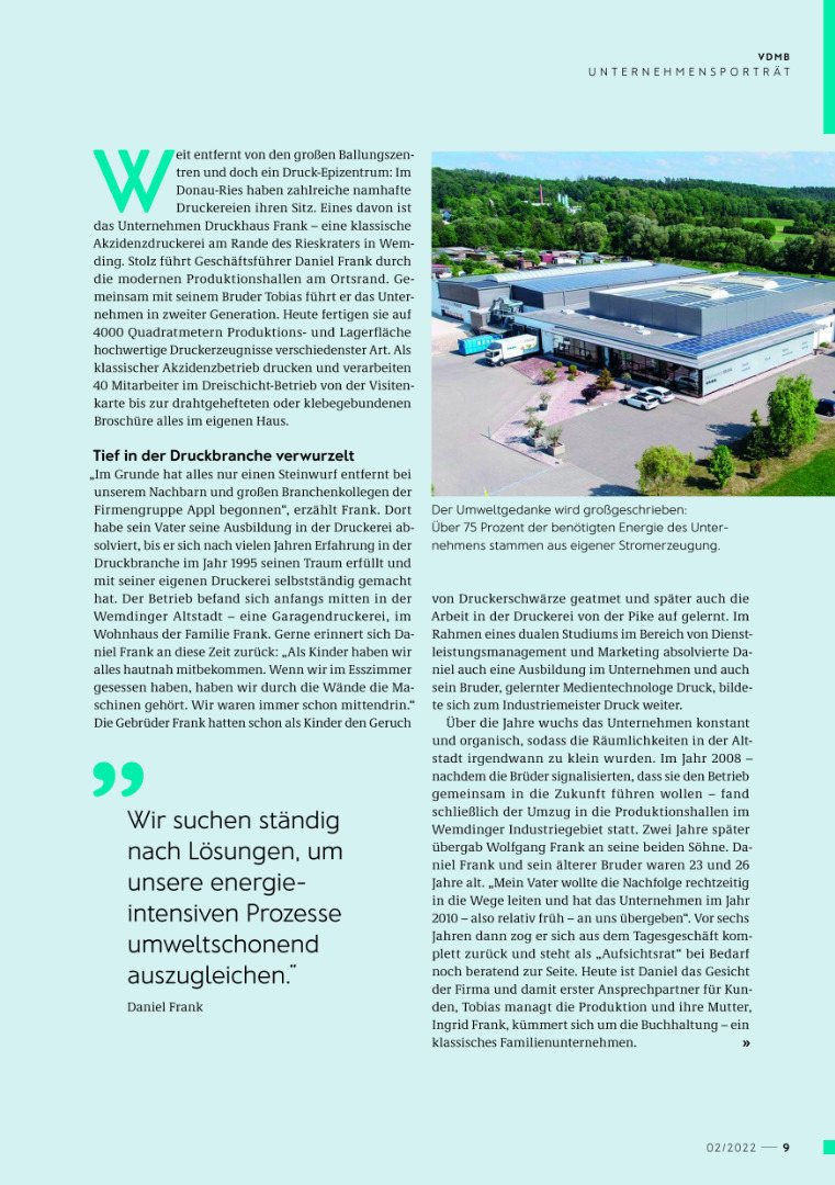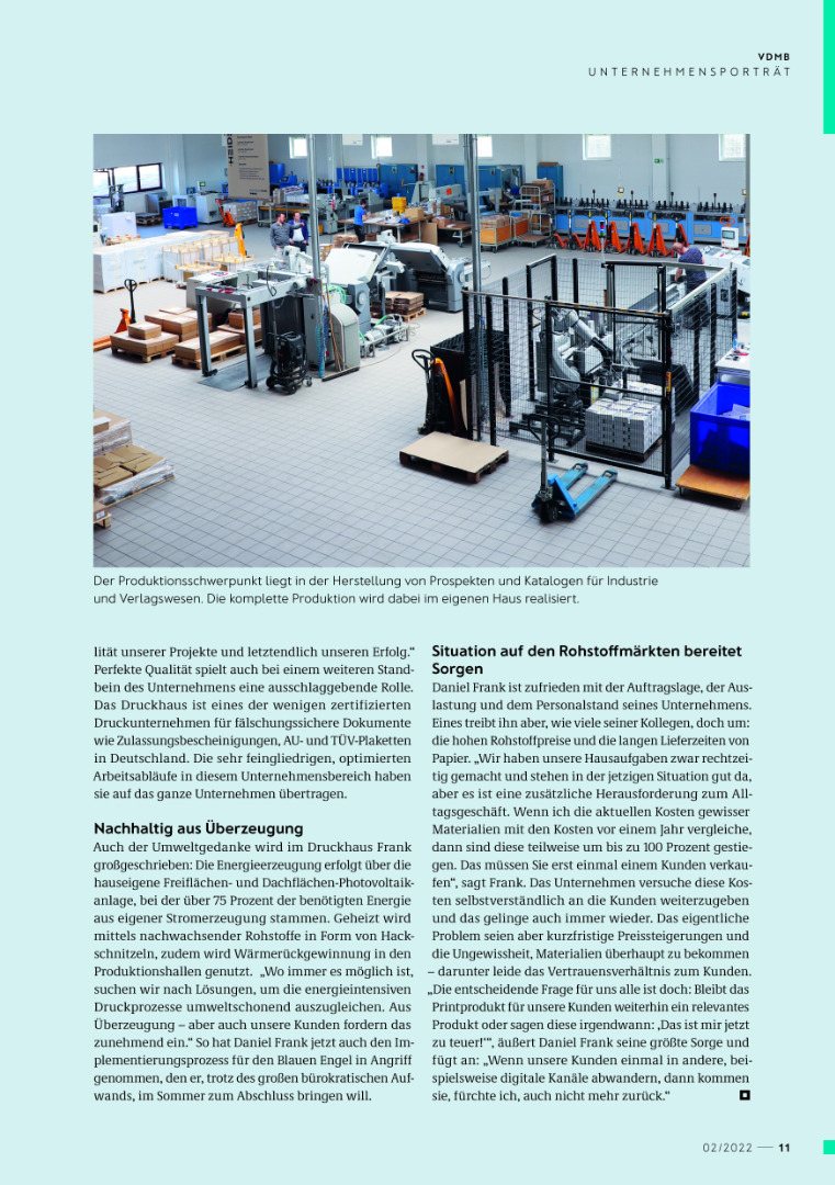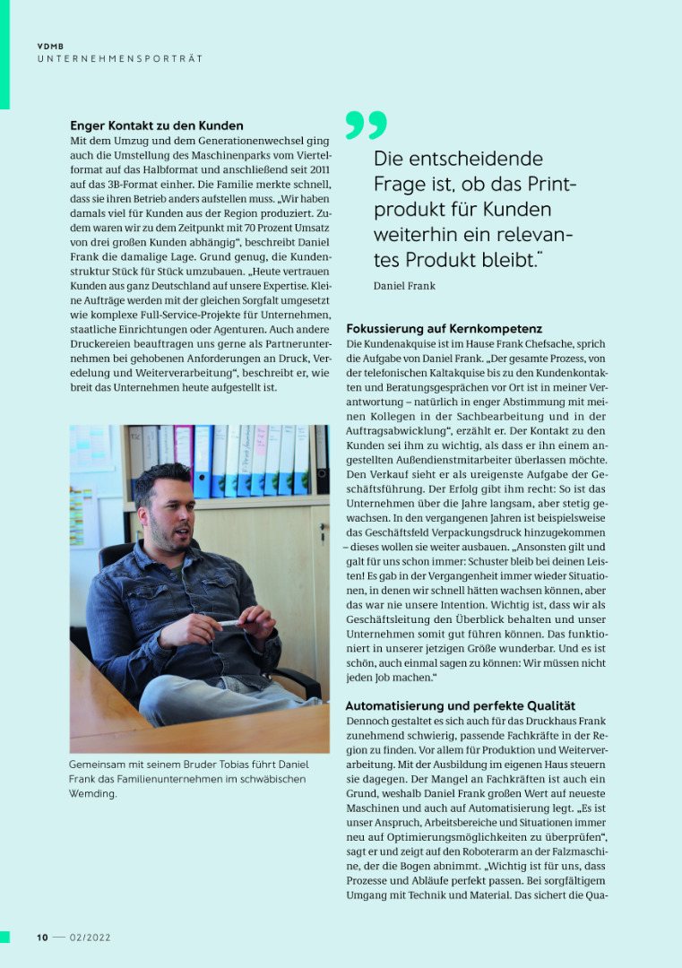 In der neuesten Ausgabe 02/2022 des Magazins „NUTZEN“ der Druck- und Medienverbände erschien in der Rubrik „Unternehmensporträt“ ein Bericht über unser mittelständisches Familienunternehmen, in dem berichtet wird wie das Druckhaus Frank als fortschrittlicher Betrieb mit klassischer Akzidenz am Markt seit Jahren erfolgreich tätig ist.